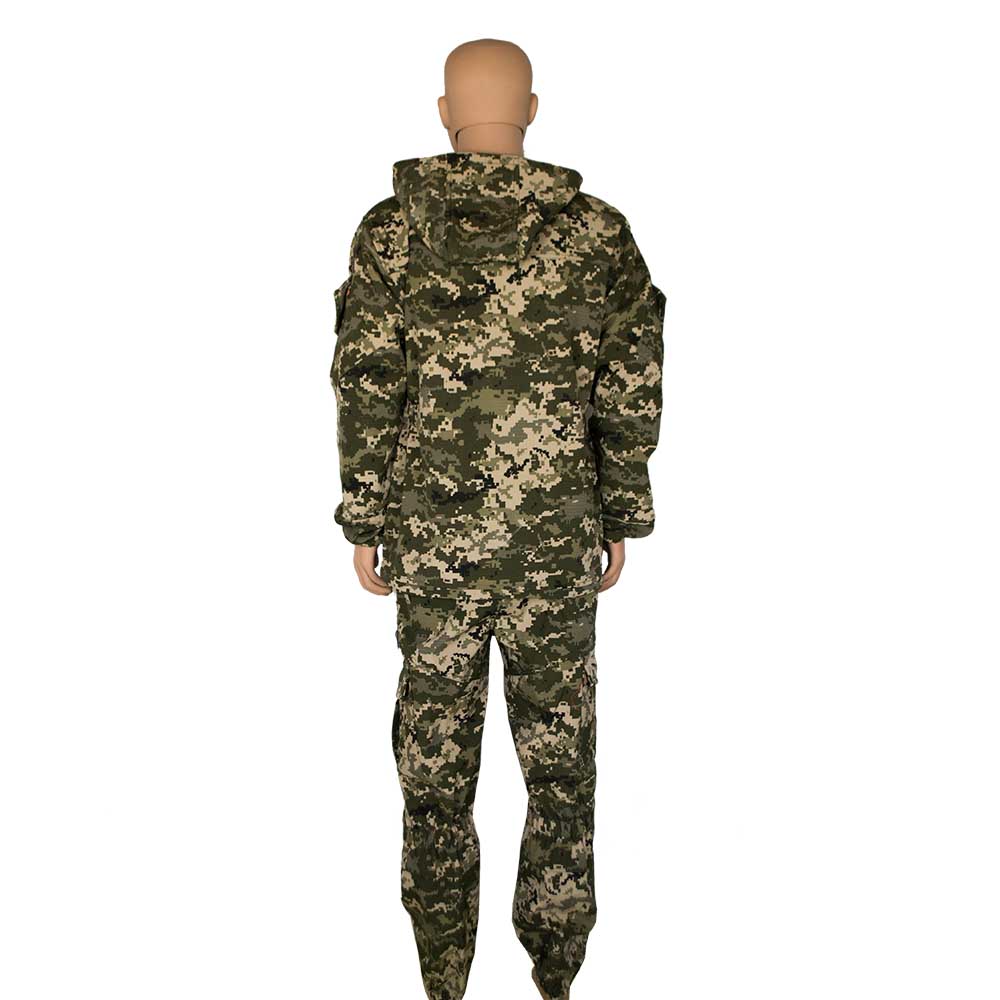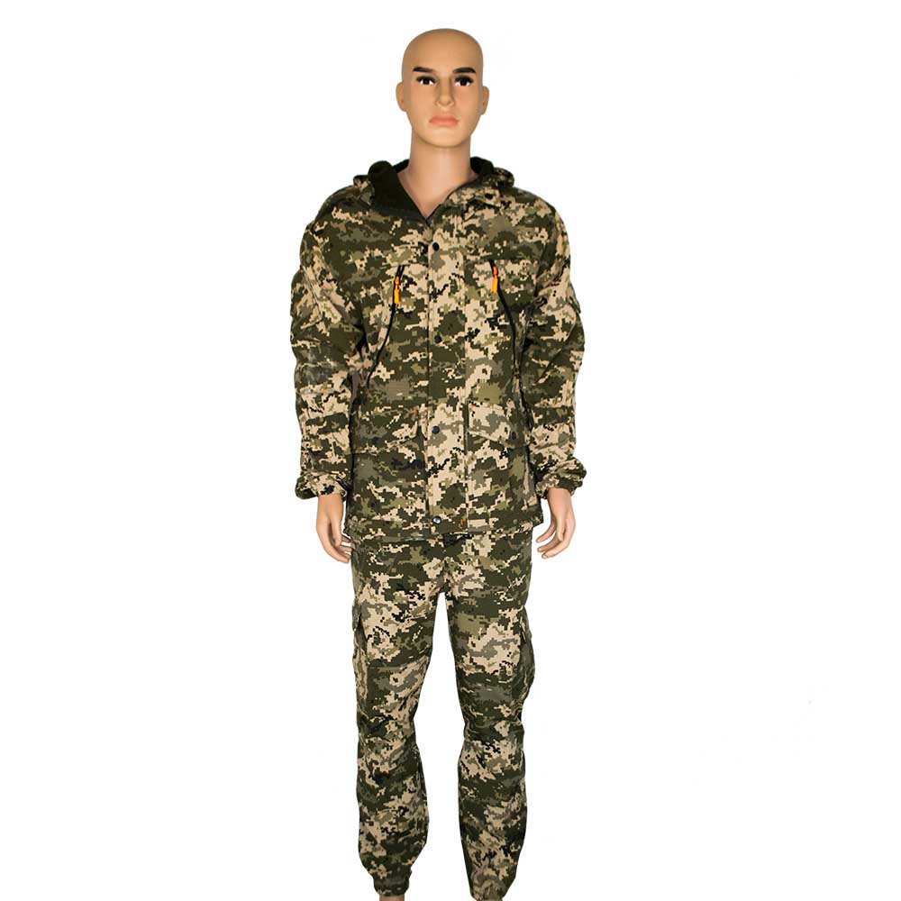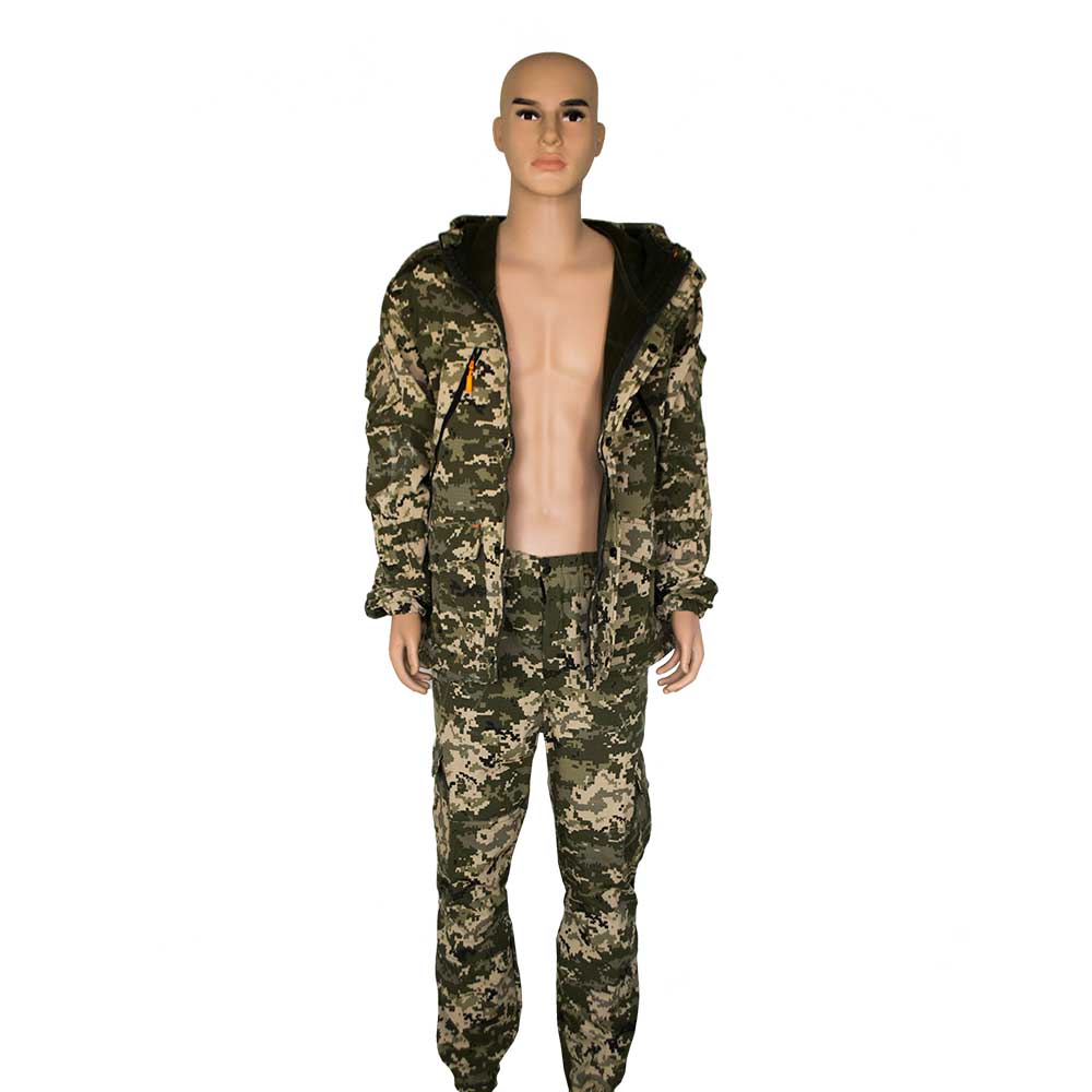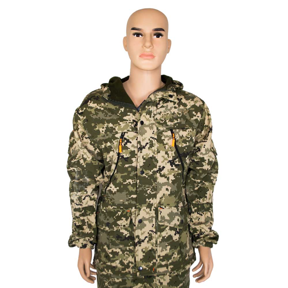 Костюм демисезонный на флисе состоит из куртки и брюк серого цвета с рисунком пиксель.