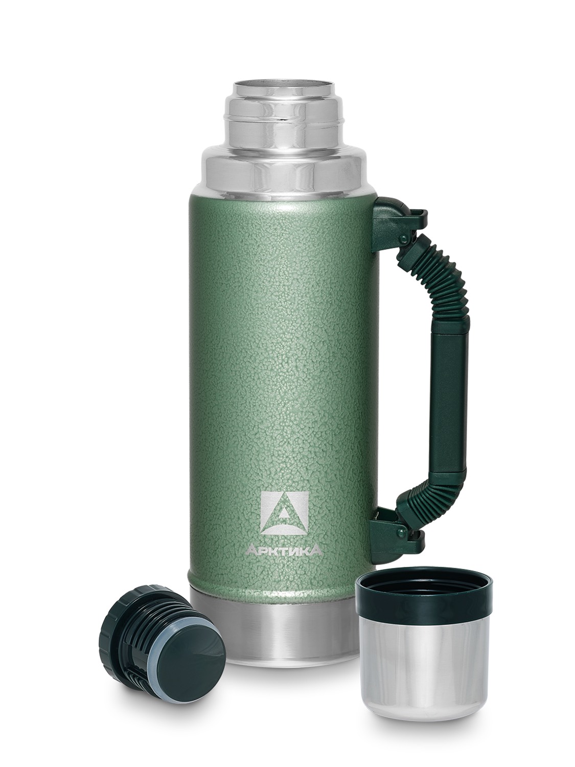 Благодаря оптимальной конструкции крышка термоса плотно прилегает к горлышку, обеспечивая 100% герметичности. Модель оснащена удобной складной ручкой для переноски. Покрытие из молотковой эмали, серия имеет 2 цвета на выбор: чёрный и зёленый.